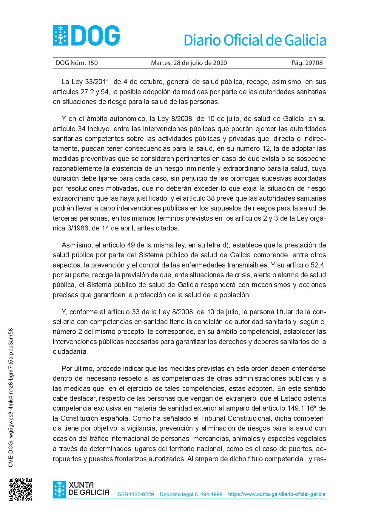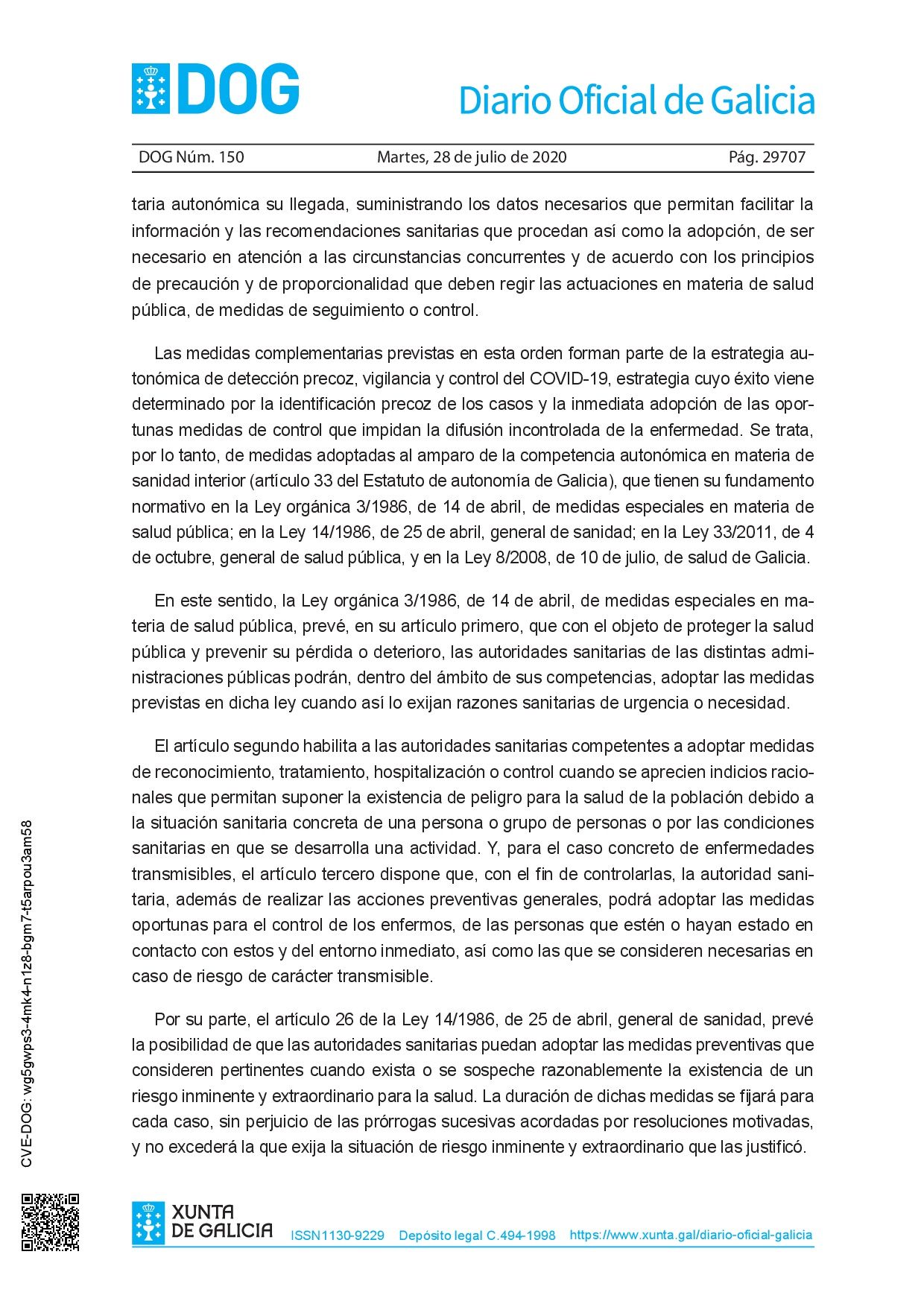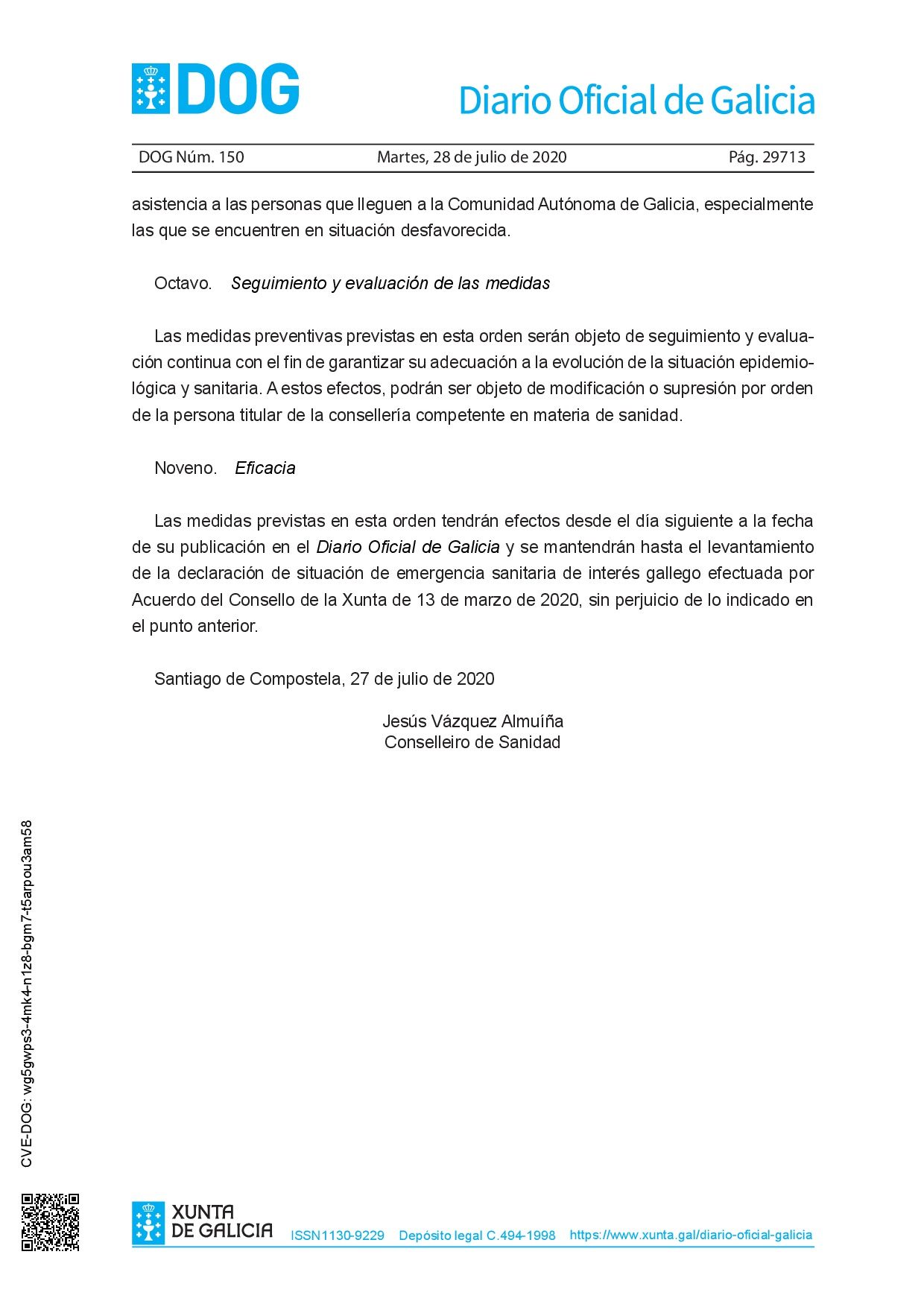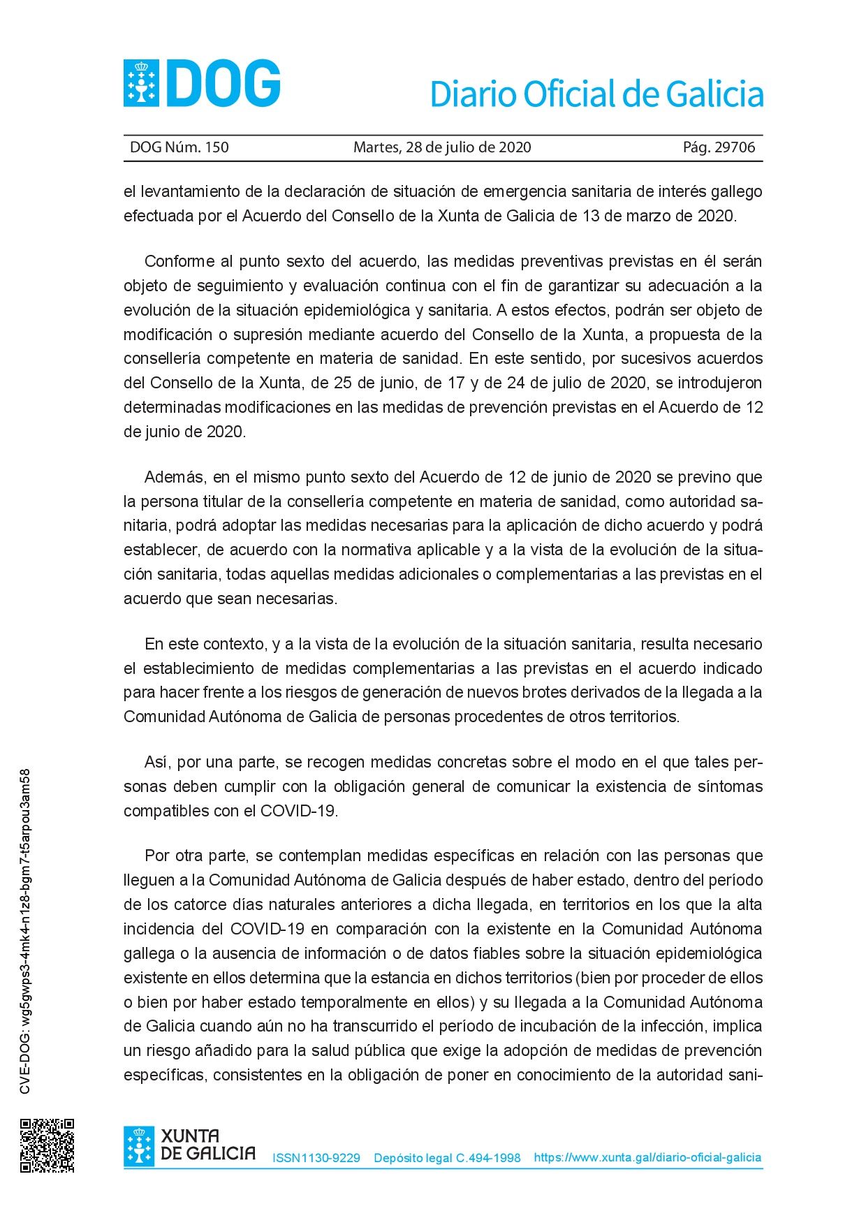 La Orden de 27 de julio de 2020 (https://www.xunta.gal/dog/Publicados/2020/20200728/AnuncioC3K1-270720-1_es.pdf) establece medidas de prevención para hacer frente a la crisis sanitaria por COVID-19 en relación con la llegada a la Comunidad Autónoma de Galicia de personas de otros territorios.
