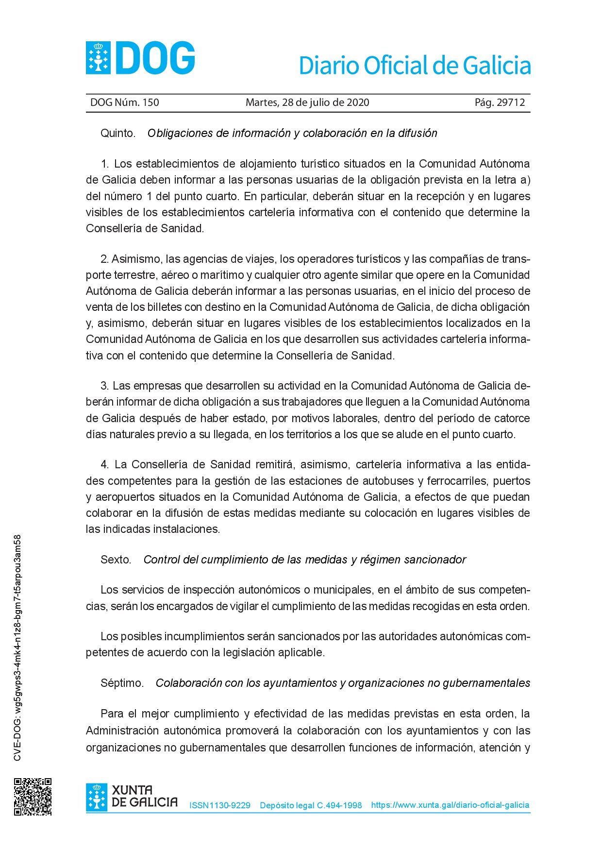 - Los establecimientos de alojamiento turístico ubicados en la Comunidad Autónoma de Galicia deberán informar a los usuarios de la obligación prevista en la letra a) del número 1 del punto cuatro. En particular, deben colocar carteles informativos con el contenido determinado por el Ministerio de Salud en la recepción y en lugares visibles en los establecimientos.