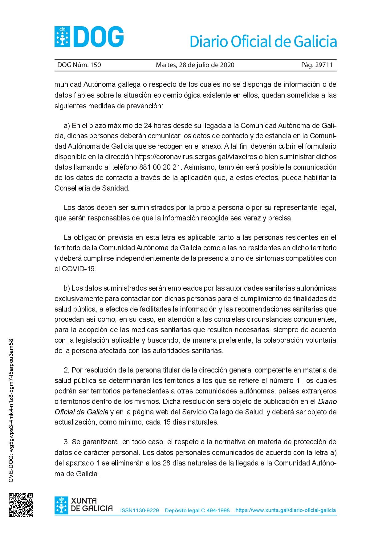 Asunto: COVID 19-XUNTA GALICIA: Comunicación de datos de personas que entran y salen de Galicia