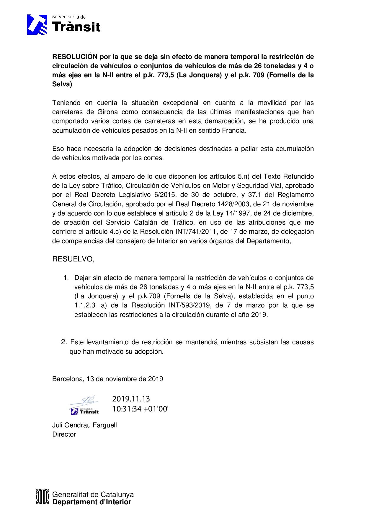 El levantamiento de la prohibición se mantendrá mientras duren las consecuencias de los disturbios. A este respecto es de señalar que persisten los problemas en al AP7 en sentido norte aunque están prácticamente en vías de solucionarse (dos carriles en cada sentido están aún cerrados mientras se reparan los desperfectos causados por los saboteadores en torno al p. k. 63 en la provincia de Gerona.