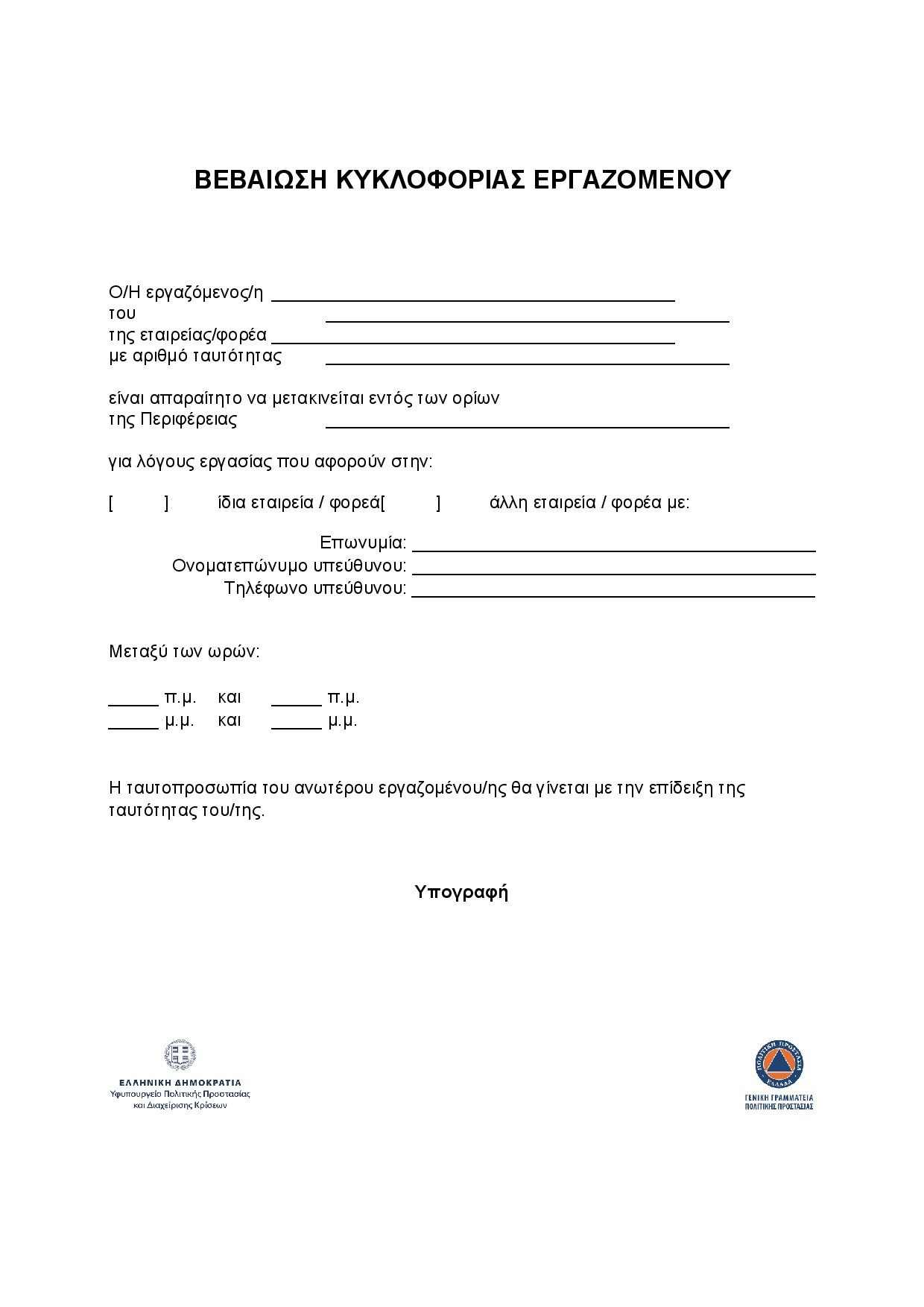 - El movimiento de ciudadanos griegos está severamente restringido en territorio griego. Se requiere autorización especial por escrito en ciertas circunstancias. Para las personas que van o vienen de su lugar de trabajo, se requiere un formulario de certificación de su empleador (adjunto Word solo en griego).