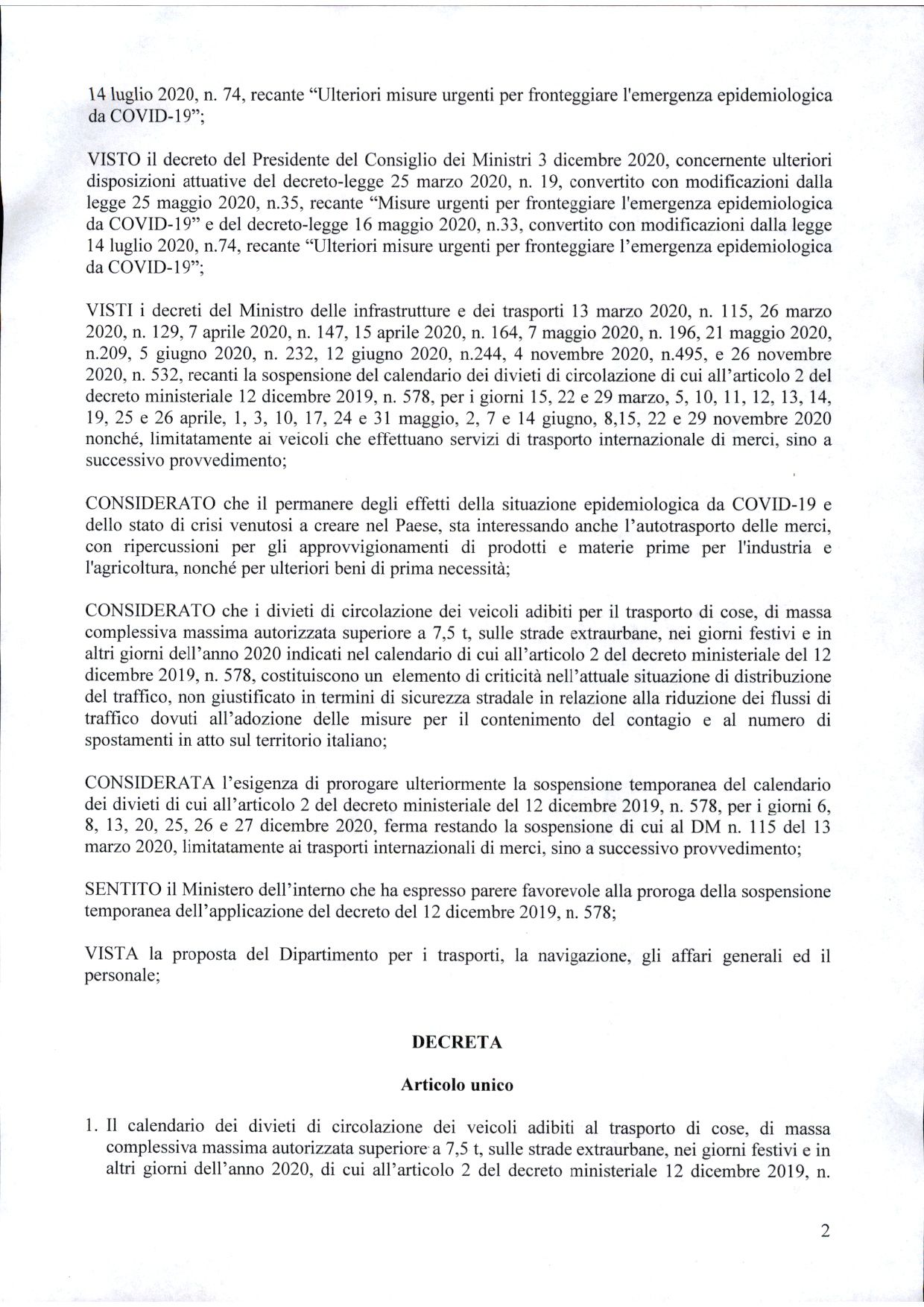 Con un Decreto firmado el viernes por la Ministra de Infraestructuras y Transportes, Paola De Micheli, el Gobierno italiano ha establecido que los vehículos pesados podrán circular también los fines de semana de diciembre y durante las vacaciones previstas para el mes. El Decreto establece que los vehículos utilizados para el transporte de mercancías, con una masa máxima total autorizada superior a 7,5 toneladas, podrán circular en los siguientes días: 6, 8, 13, 20, 25, 26 y 27 de diciembre.