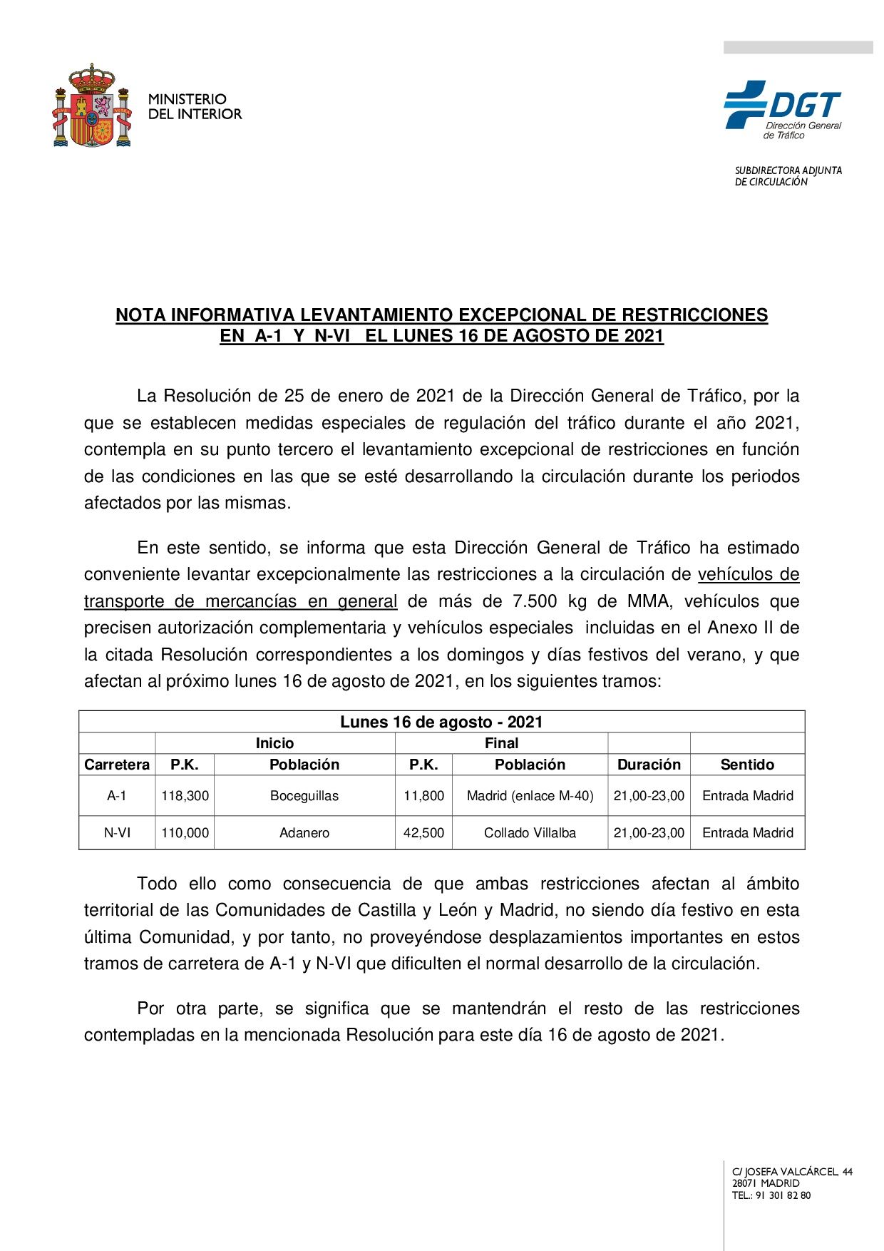 Se traslada Nota informativa indicando el levantamiento de las restricciones a la circulación de vehículos de más de 7.500 kg de MMA, vehículos que precisen autorización complementaria y vehículos especiales contempladas en el Anexo II de la Resolución que les fueran de aplicación durante el próximo lunes 16 de agosto en los siguientes tramos.