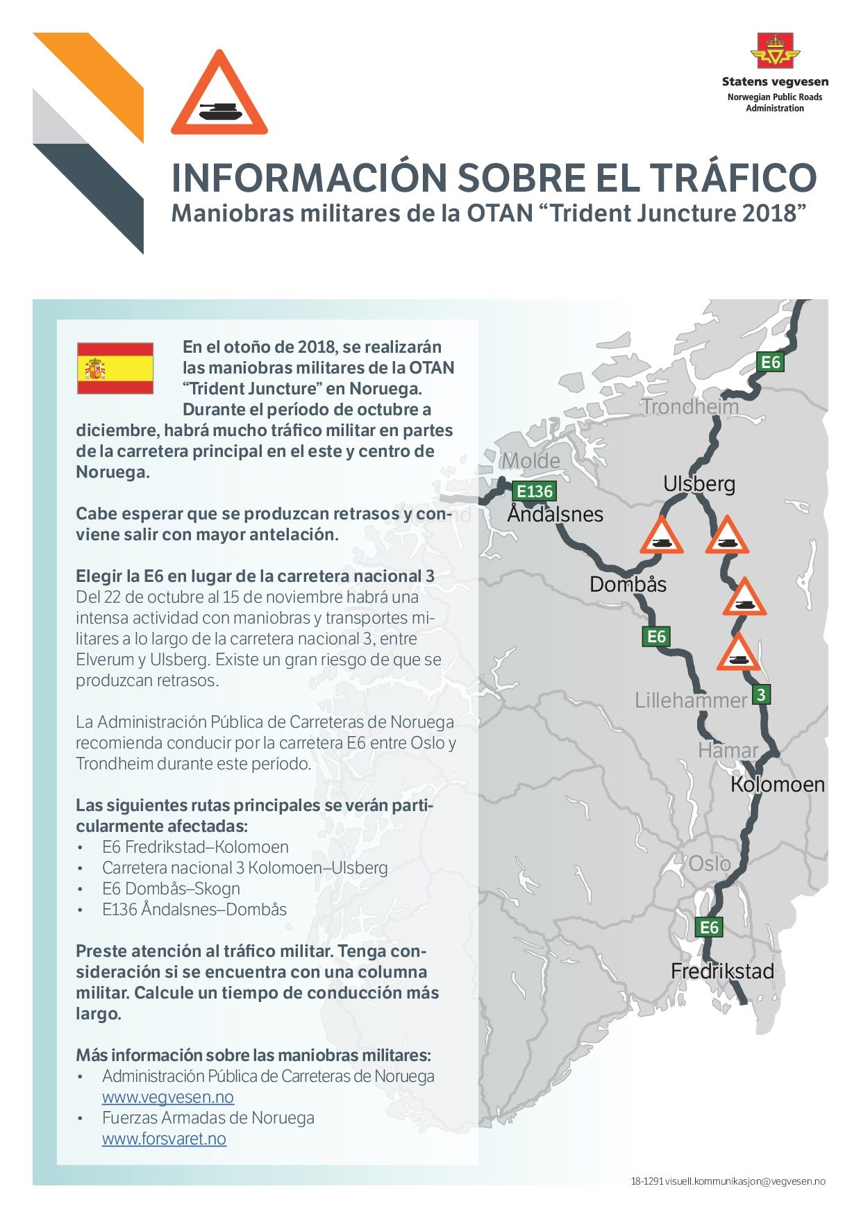 En el período de octubre a diciembre habrá un extenso tráfico militar en secciones de la red principal de carreteras en el este y centro de Noruega. Se esperanretrasos por lo que hay que tenerl en cuenta el tiempo de conducción adicional.