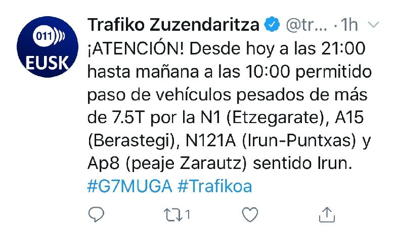 ¡ATENCIÓN! Desde hoy a las 21:00h hasta mañana a las 10:00h permitido paso de vehículos pesados de más de 7.5T por la N1 (Etzegarate), A15 (Berastegi), N121A (Irún-Puntxas) y Ap8 (peaje Zarautz) sentido Irún.