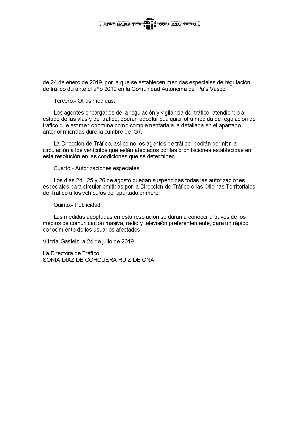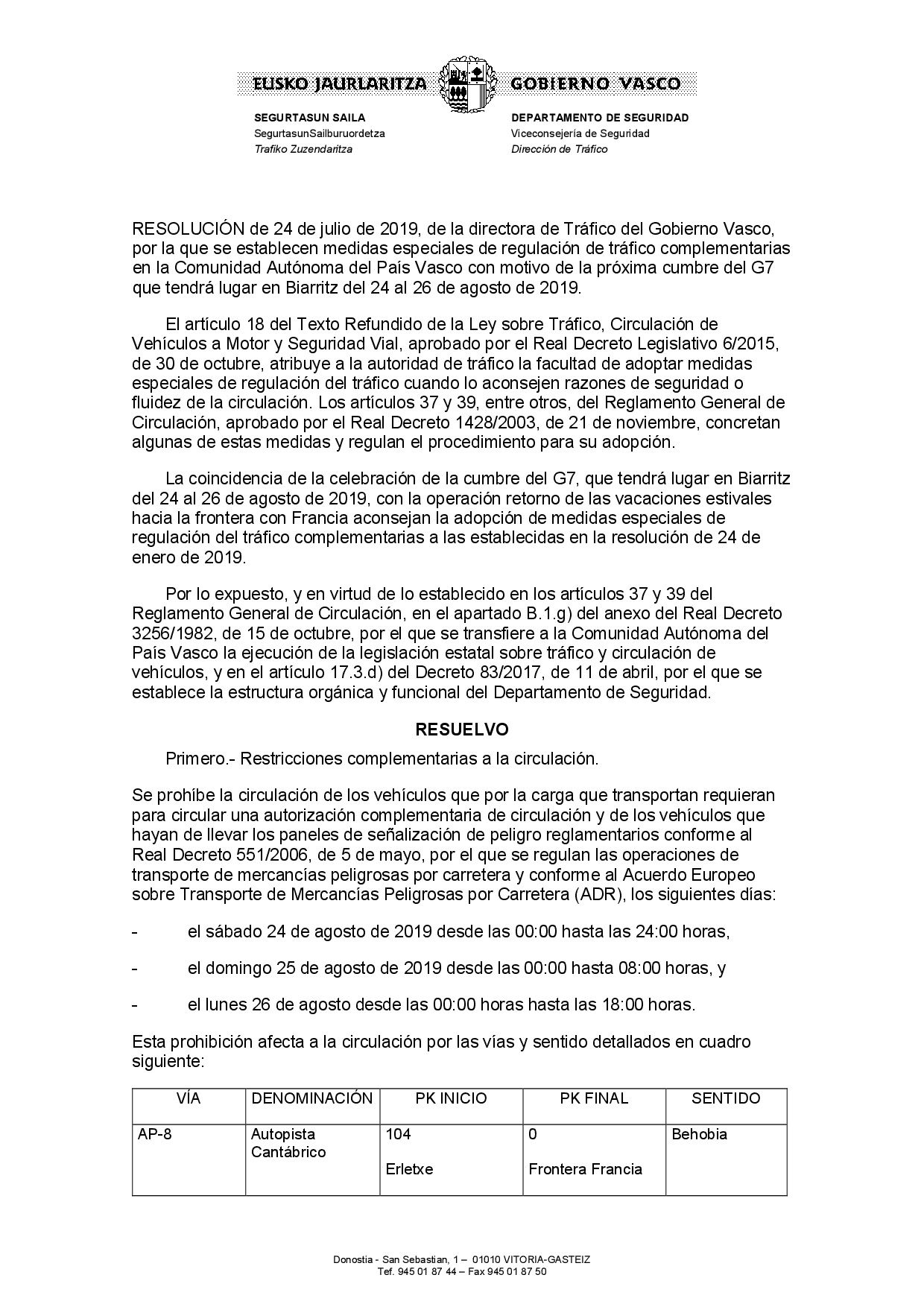 Le comunicamos la resolución de la directora de Tráfico del Gobierno Vasco por la que se establecen medidas especiales de regulación de tráfico complementarias en la Comunidad Autónoma del País Vasco con motivo de la próxima cumbre del G7 que tendrá lugar en Biarritz del 24 al 26 de agosto de 2019.