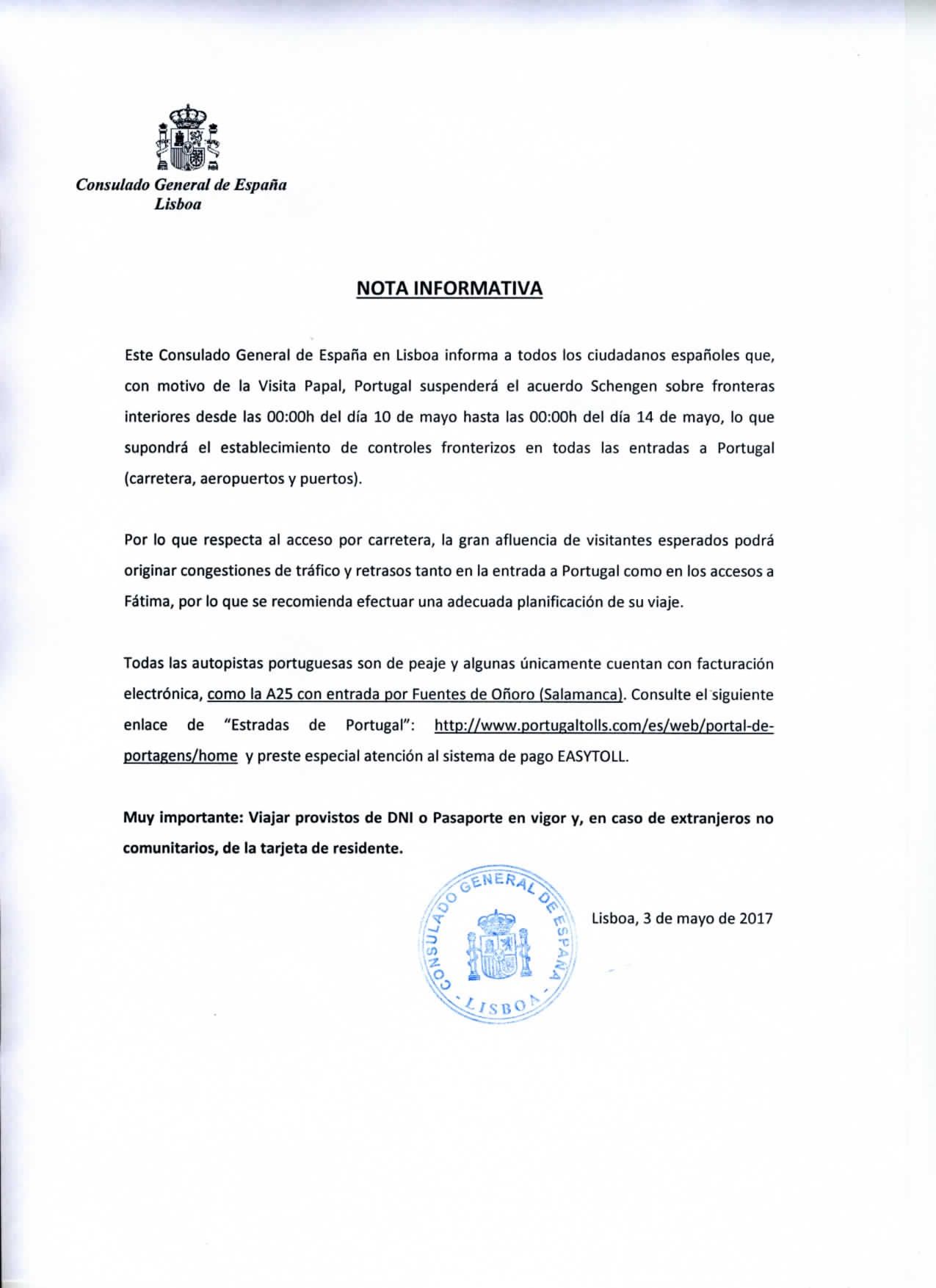 Debido a la visita del Papa Francisco a Fátima los próximos 12 y 13 de mayo y las grandes multitudes esperadas en esta ocasión, el Gobierno portugués ha decidido restaurar el control documental en las fronteras portuguesas para ciudadanos nacionales, de la Unión Europea y no miembros de la misma.