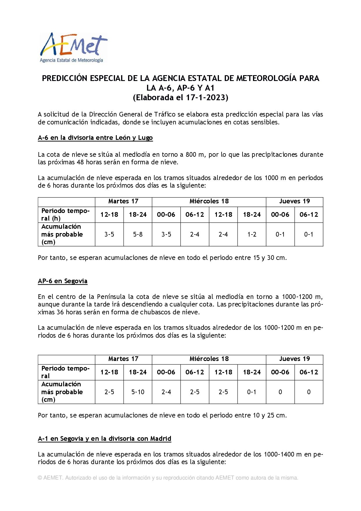 Les preocupa especialmente lo que suceda en la AP6 y en la A1. Por este motivo han solicitado a AEMET un informe con las previsiones de acumulación de nieve a fecha actual.