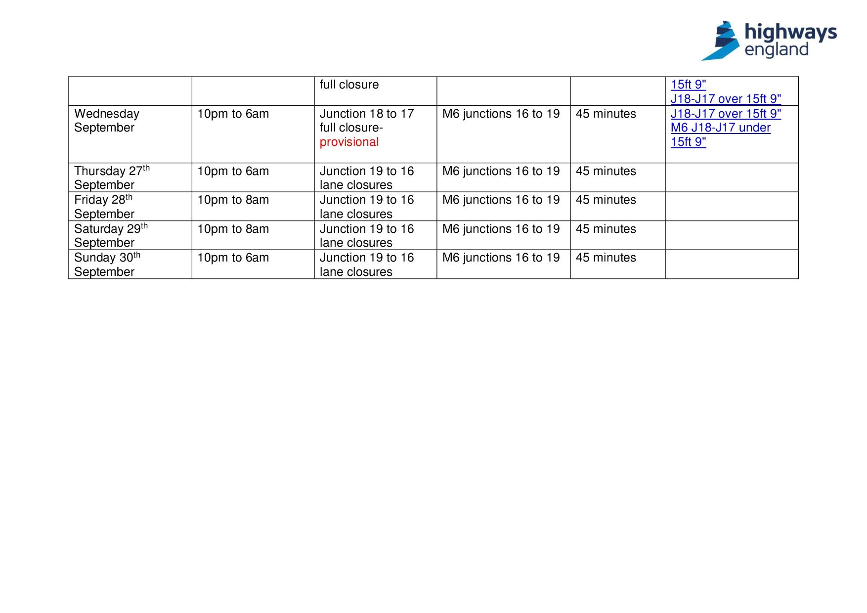 Para limitar la cantidad de tiempo durante el cual se cerrará la autopista, han decidido no demoler todas las partes del puente al mismo tiempo. Por esta razón, tendrán que cerrar la M6 entre las intersecciones 14 y 15 en ambas direcciones el sábado 6 de octubre de 2018 entre las 8 p.m. y las 8 a.m. para eliminar los tramos del lado del puente. También tendrán que cerrar la calzada hacia el sur entre las intersecciones 15 y 14 el miércoles 3 de octubre, el jueves 4 de octubre, el viernes 5 de octubre y el lunes 8 de octubre entre las 9 p.m. y las 6 a.m. para instalar una nueva barrera de seguridad.