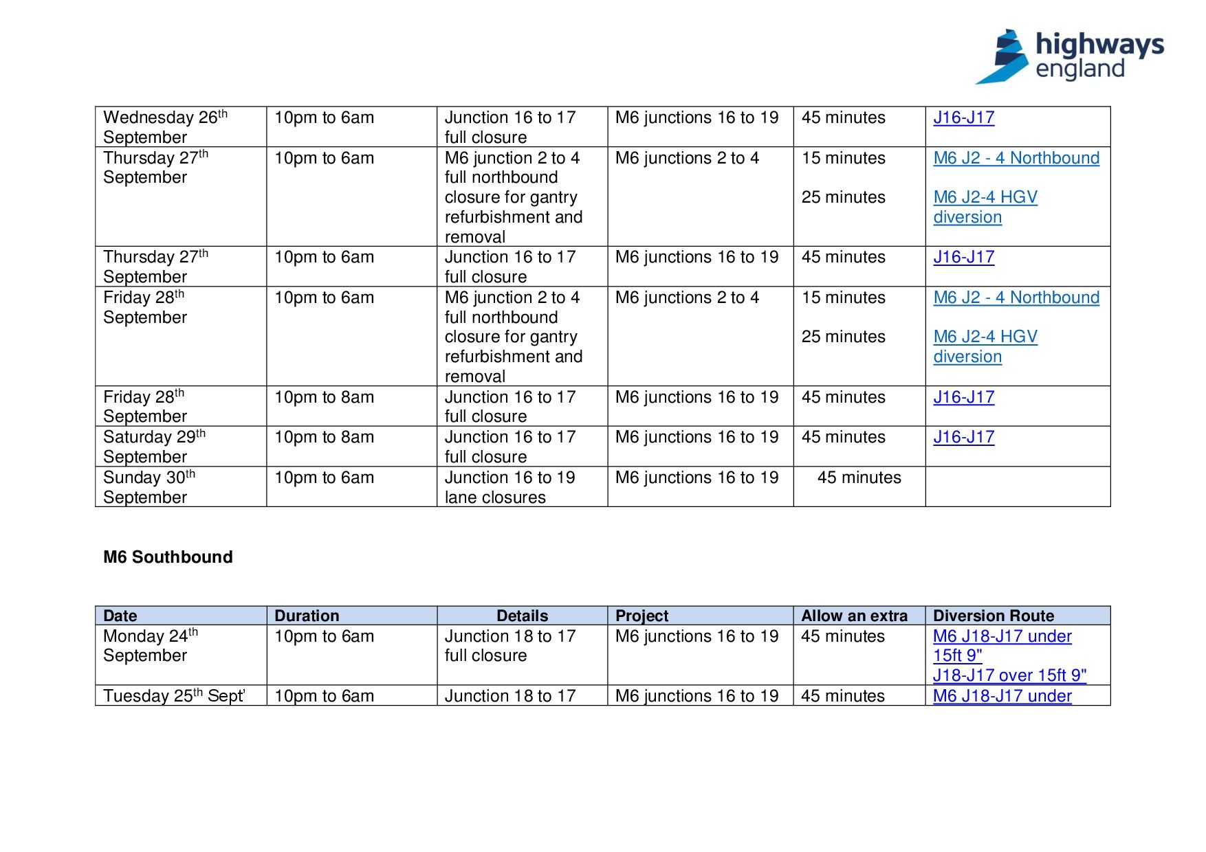 Adjunto puede encontrar detalle del cierre planificado en la M6 entre las salidas 2 y 19, por obras para autopistas inteligentes a partir del 24 de septiembre.