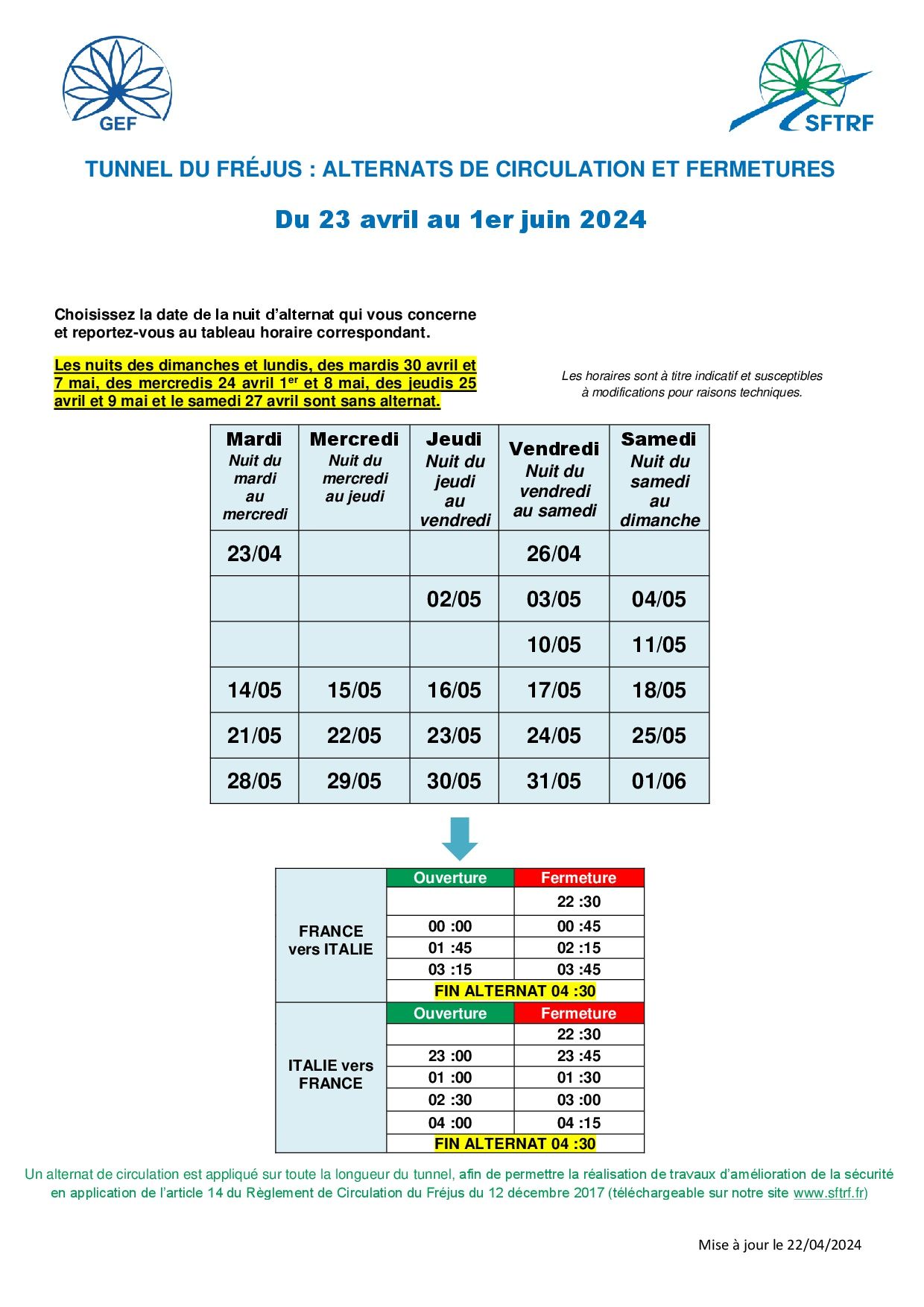 El calendario detallado de interrupciones y contraflujos en el túnel de Fréjus del 23 de abril al 1 de junio de 2024 está disponible en el archivo adjunto.