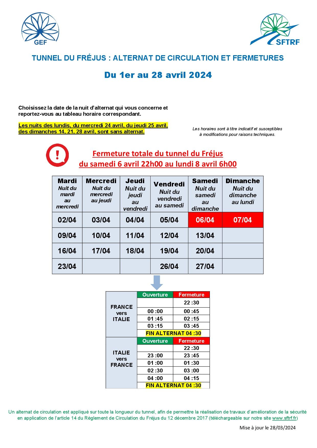 Debido a las obras de mantenimiento, el tráfico quedará totalmente interrumpido en el túnel de Fréjus, en ambos sentidos, desde el sábado 6 de abril a partir de las 22 h hasta el lunes 8 de abril a las 6 h.