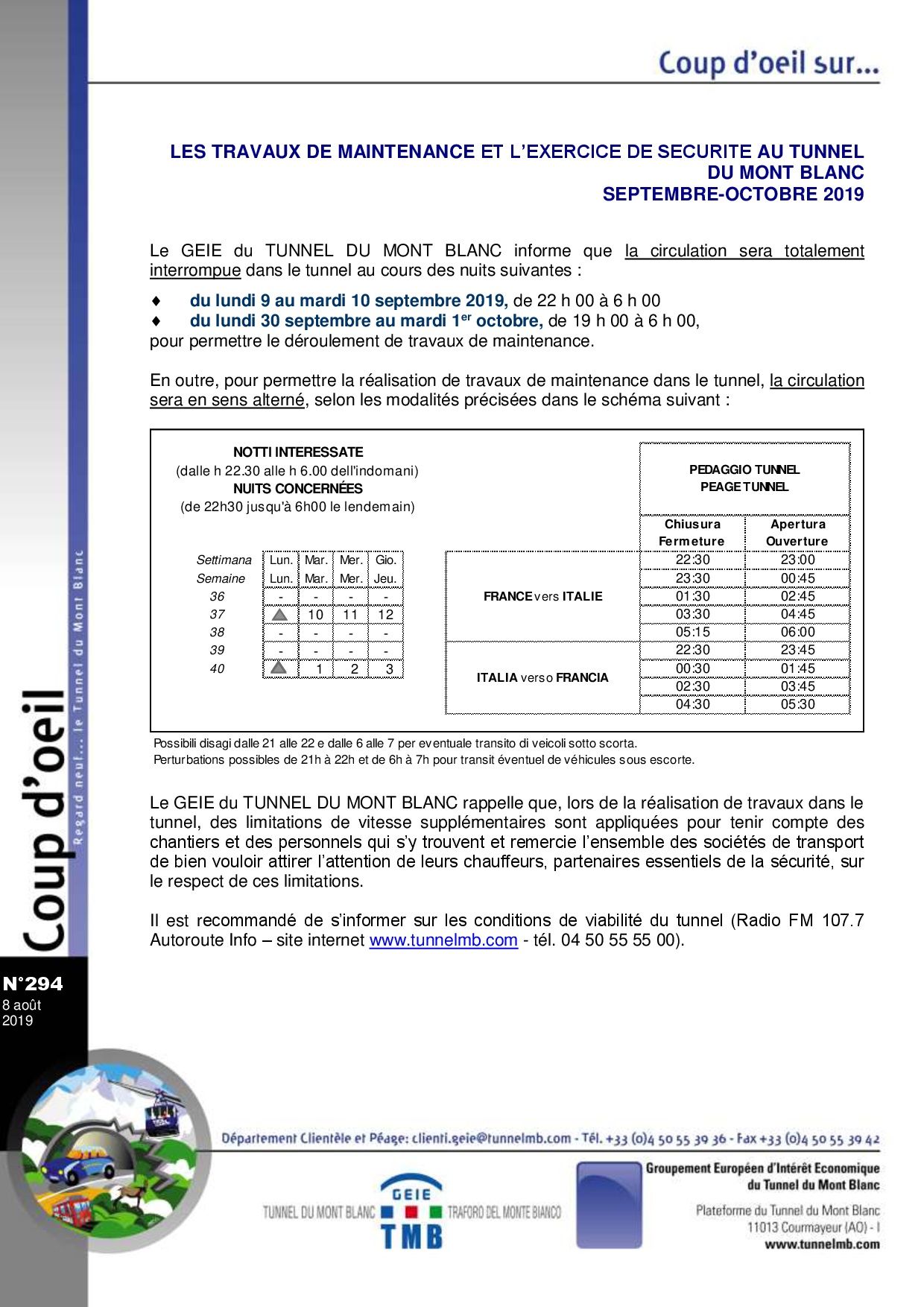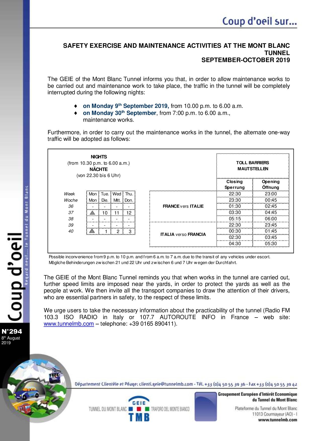 El Túnel del Mont Blanc le informa que, para permitir que se realicen trabajos de mantenimiento, el tráfico en el túnel se interrumpirá por completo durante las siguientes noches: