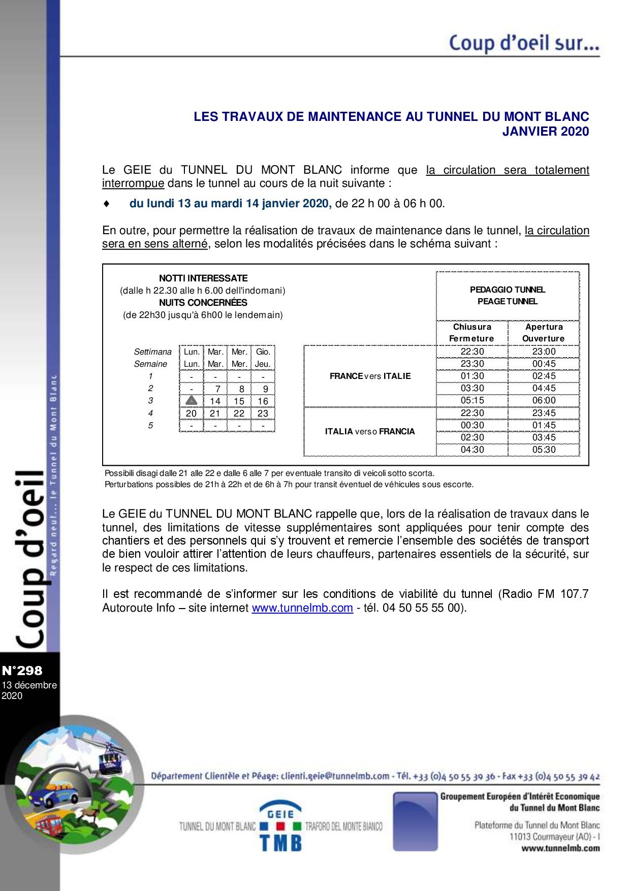 Como continuación a nuestro Flash Informativo de octubre en el que se informaba de los cortes que se iban a realizar en el Túnel del Mont Blanc durante los meses de noviembre y diciembre, esta vez les comunicamos los que tendrán lugar en el mes de enero:
