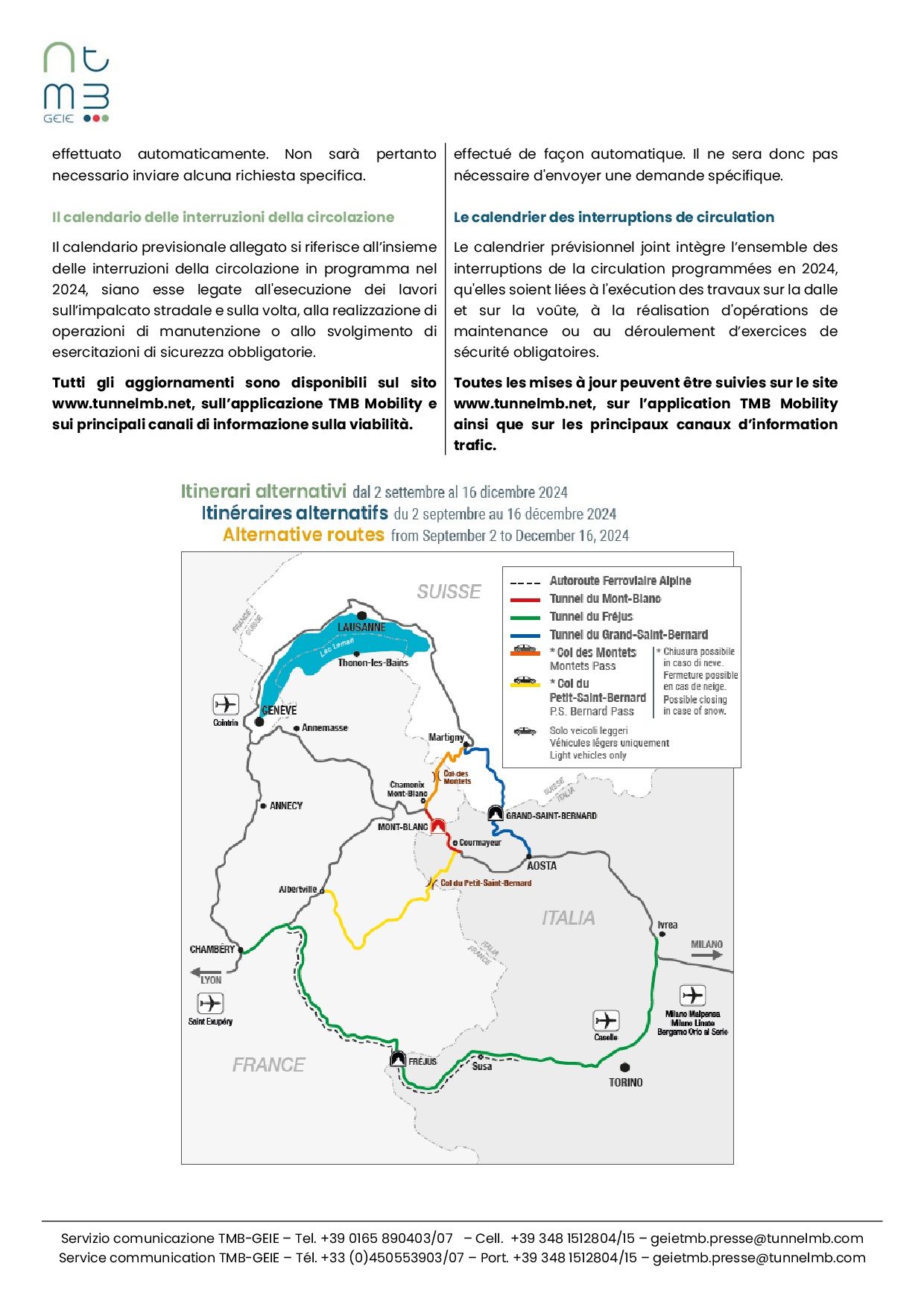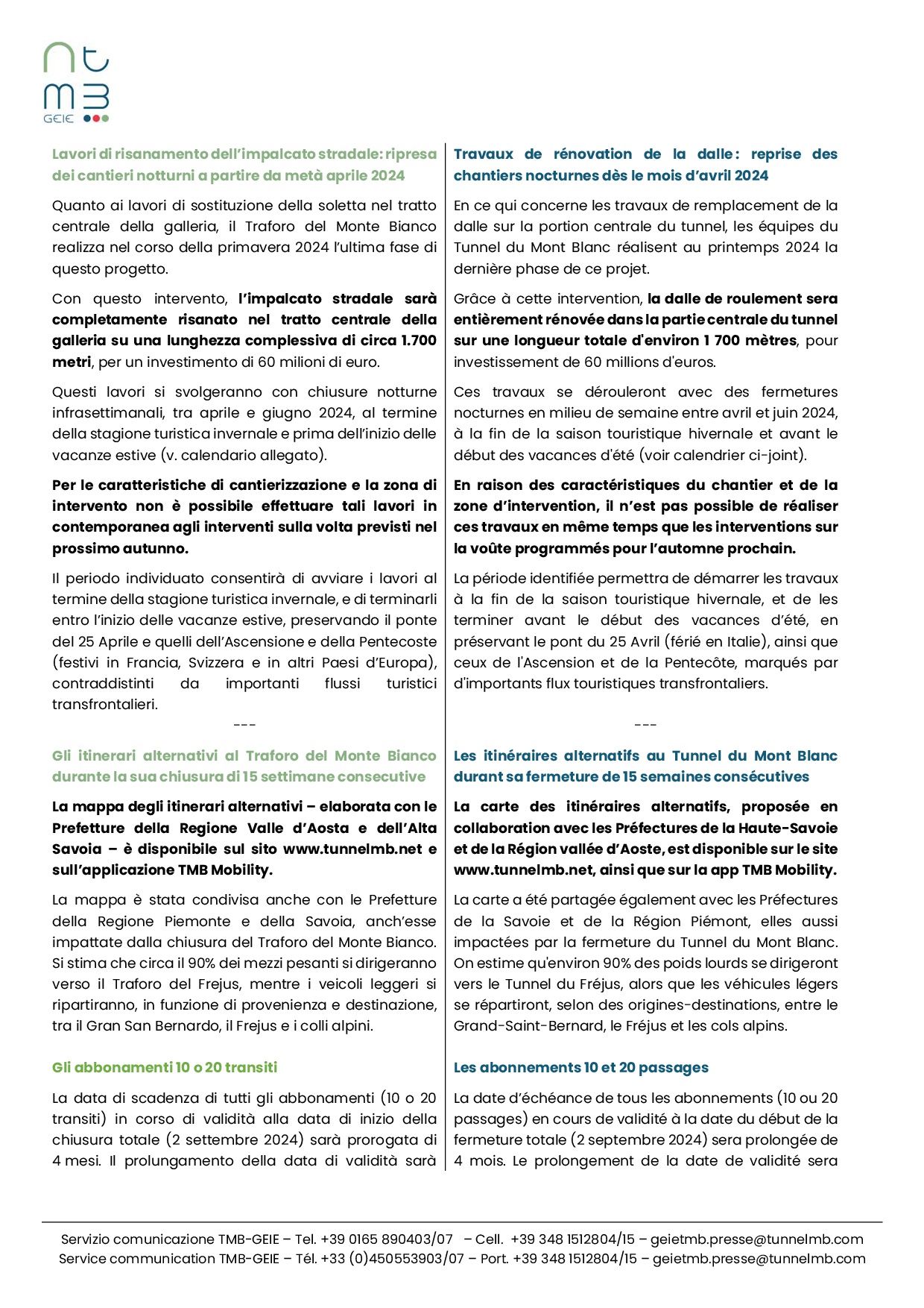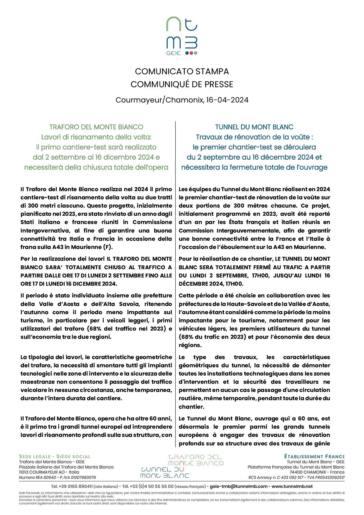 La reconstrucción completa de dos tramos de la bóveda del túnel de 300 metros cada uno se reprogramó para 2024. Estas actividades requerirán el cierre total del túnel del Mont Blanc durante 15 semanas, del 2 de septiembre (17:00h) al 16 de diciembre (17:00h).
